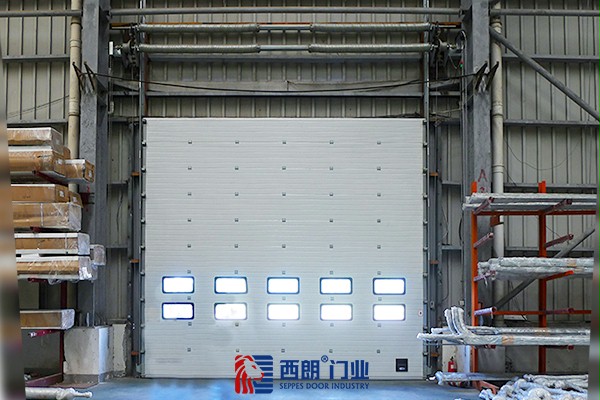 整体式提升门:工业门的门板是分段式的,然后通过铰链连接成一个整体,然后在直升轨道内运行。尺寸较大的整体式提升门可以在垂直方向使用型材加强抗风强度。