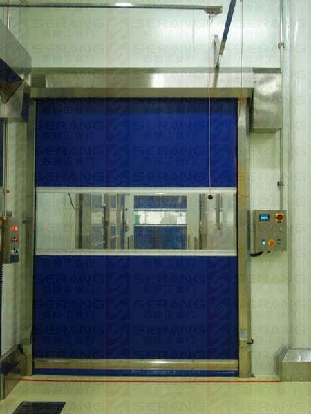 下图为:食品车间西朗不锈钢快速门,该快速门采用德国品牌拉绳开关、品牌红外电眼保护系统和304优质不锈钢精工处理以及高品质的不锈钢配重,还有西朗门业自主开发的带有人机界面显示的控制系统。